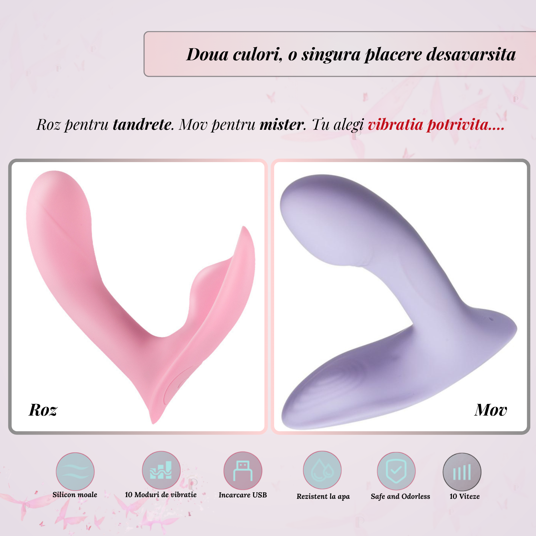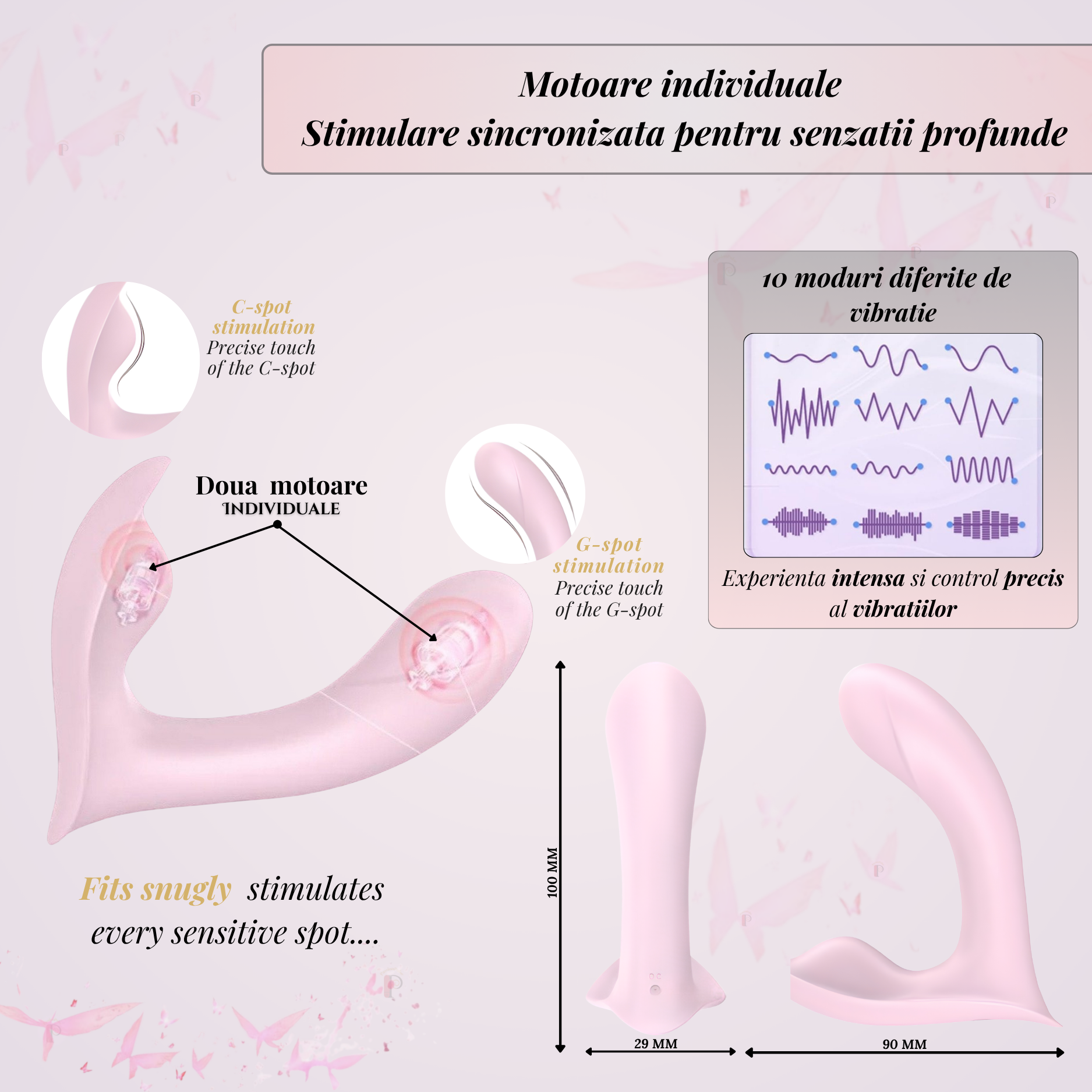 Stimulare sincronizată pentru senzații profunde. Dispozitivul este echipat cu două motoare independente, special concepute pentru stimularea simultană a zonelor G-spot și C-spot. Cele 10 moduri diferite de vibrație îți permit să alegi între pulsații blânde sau vibrații profunde, controlate precis printr-un singur buton intuitiv.